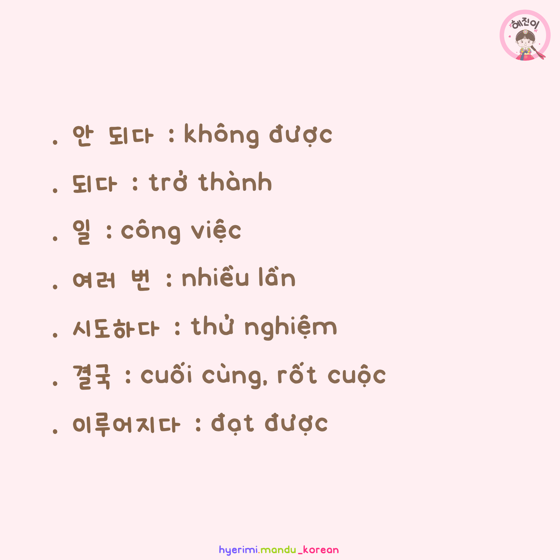 . 안 되다 : không được . 되다 : trở thành . 일 : công việc . 여러 번 : nhiều lần . 시도하다 : thử nghiệm . 결국 : cuối cùng, rốt cuộc . 이루어지다 : đạt được