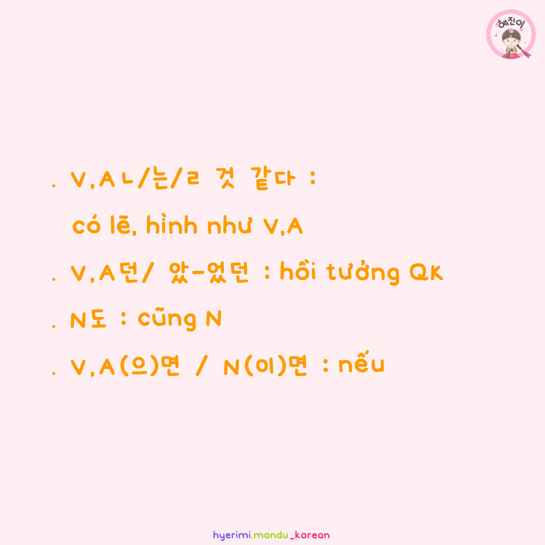 . V,Aㄴ/는/ㄹ 것 같다 : có lẽ, hình như V,A . V,A던/ 았-었던 : hồi tưởng QK . N도 : cũng N . V,A(으)면 / N(이)면 : nếu