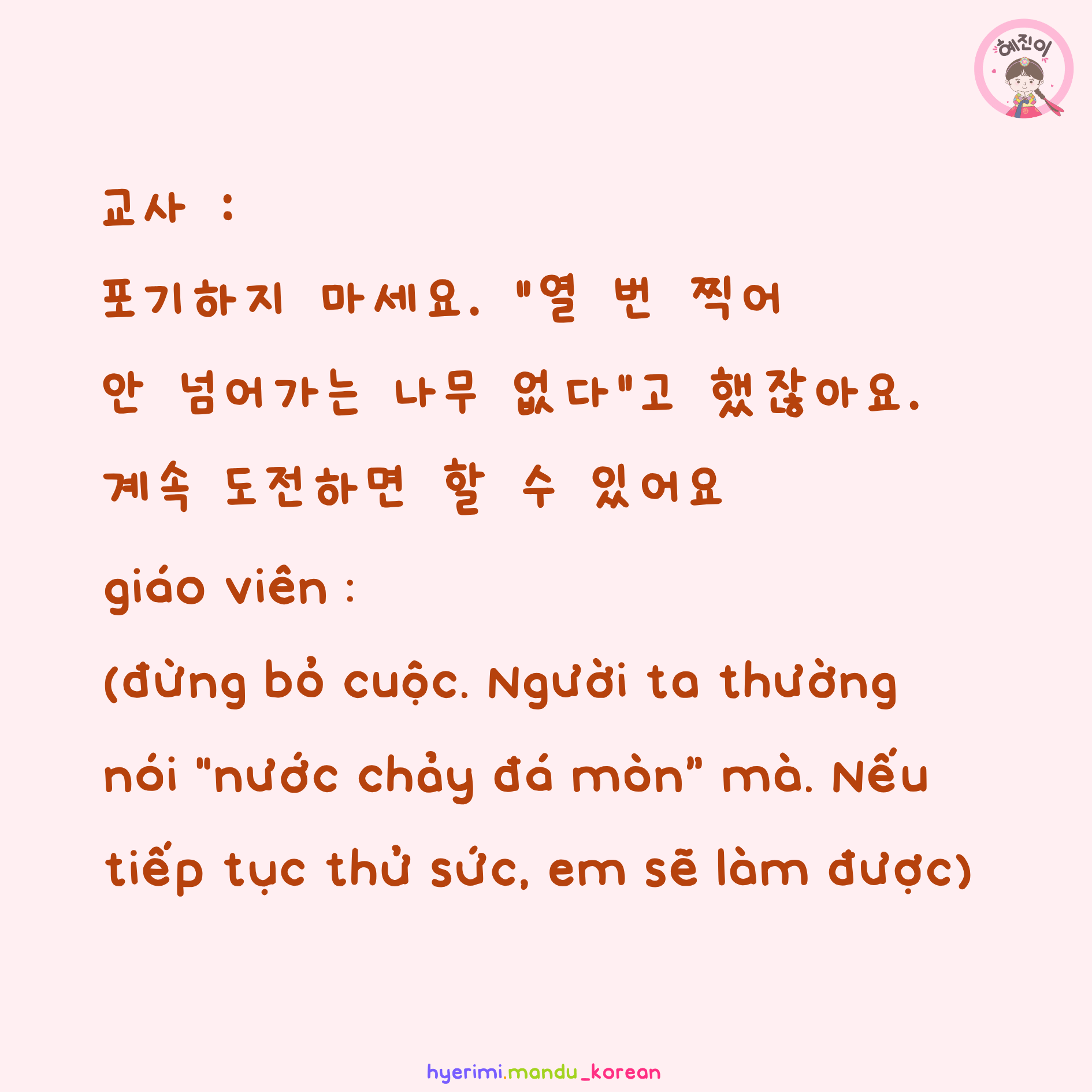 교사 : 포기하지 마세요. "열 번 찍어 안 넘어가는 나무 없다"고 했잖아요. 계속 도전하면 할 수 있어요 (giáo viên : đừng bỏ cuộc. Người ta thường nói "nước chảy đá mòn mà". Nếu tiếp tục thử sức, em sẽ làm được)