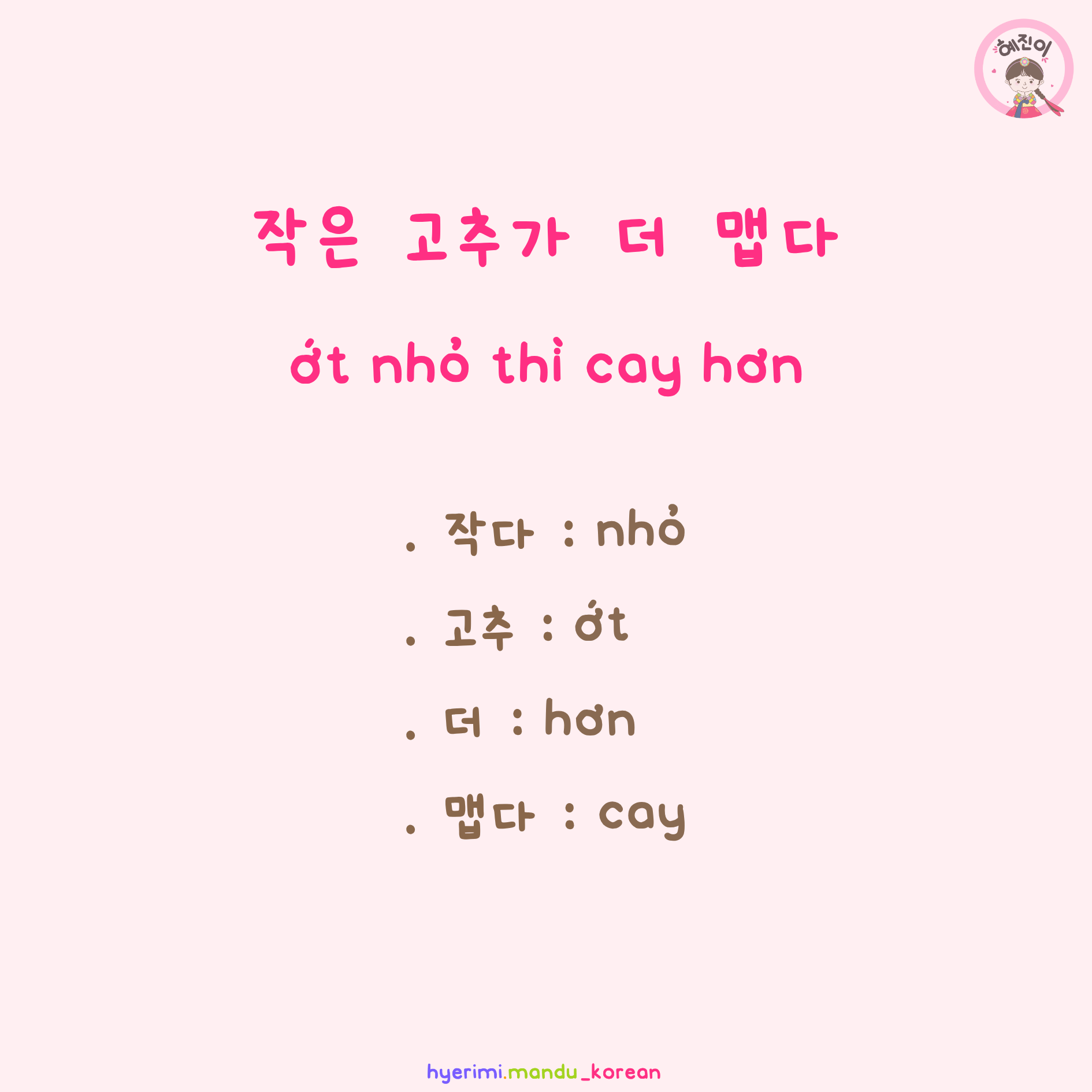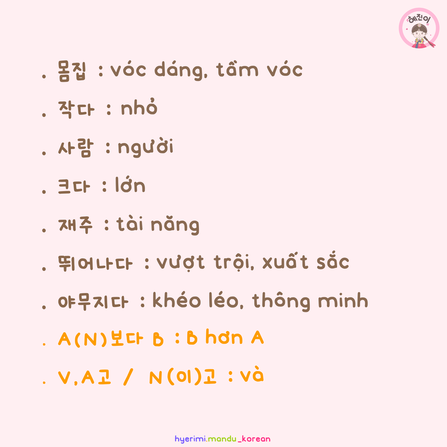 . 몸집 : vóc dáng, tầm vóc . 작다 : nhỏ . 사람 : người . 크다 : lớn . 재주 : tài năng . 뛰어나다 : vượt trội, xuất sắc . 야무지다 : khéo léo, thông minh . A(N)보다 B : B hơn A . V,A고 / N(이)고 : và