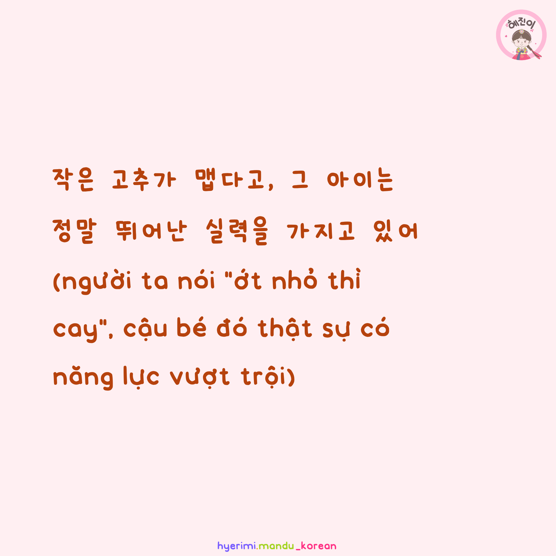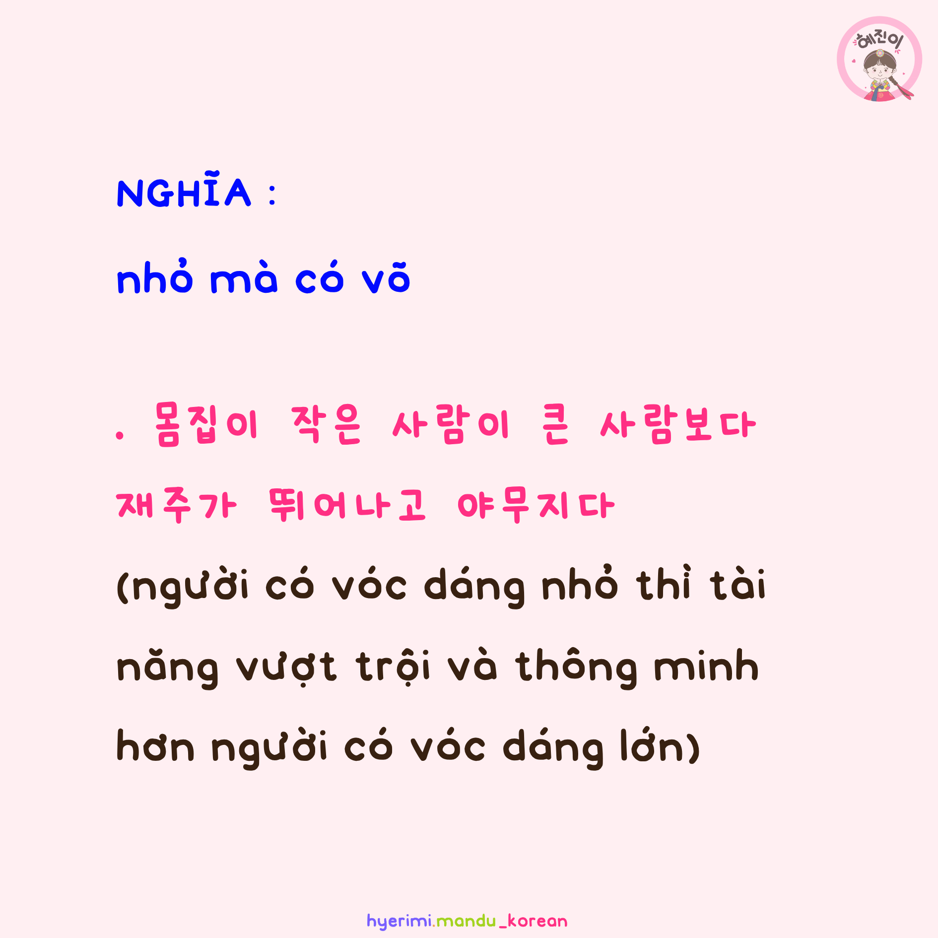 . 몸집이 작은 사람이 큰 사람보다 재주가 뛰어나고 야무지다 (người có vóc dáng nhỏ thì tài năng vượt trội và thông minh hơn người có vóc dáng lớn)
