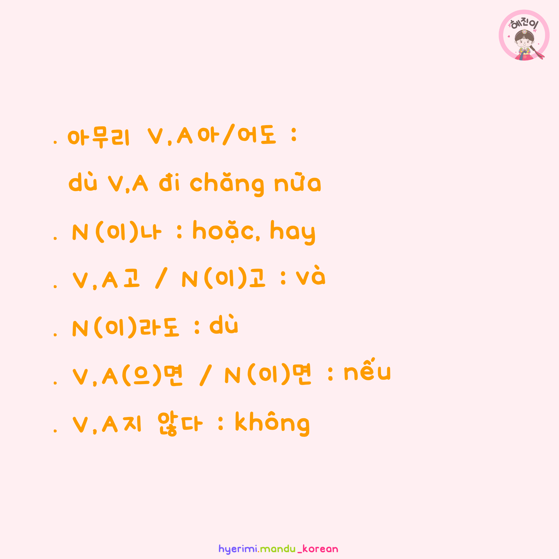 . 아무리 V,A아/어도 : dù V,A đi chăng nữa . N(이)나 : hoặc, hay . V,A고 / N(이)고 : và . N(이)라도 : dù . V,A(으)면 / N(이)면 : nếu . V,A지 않다 : không