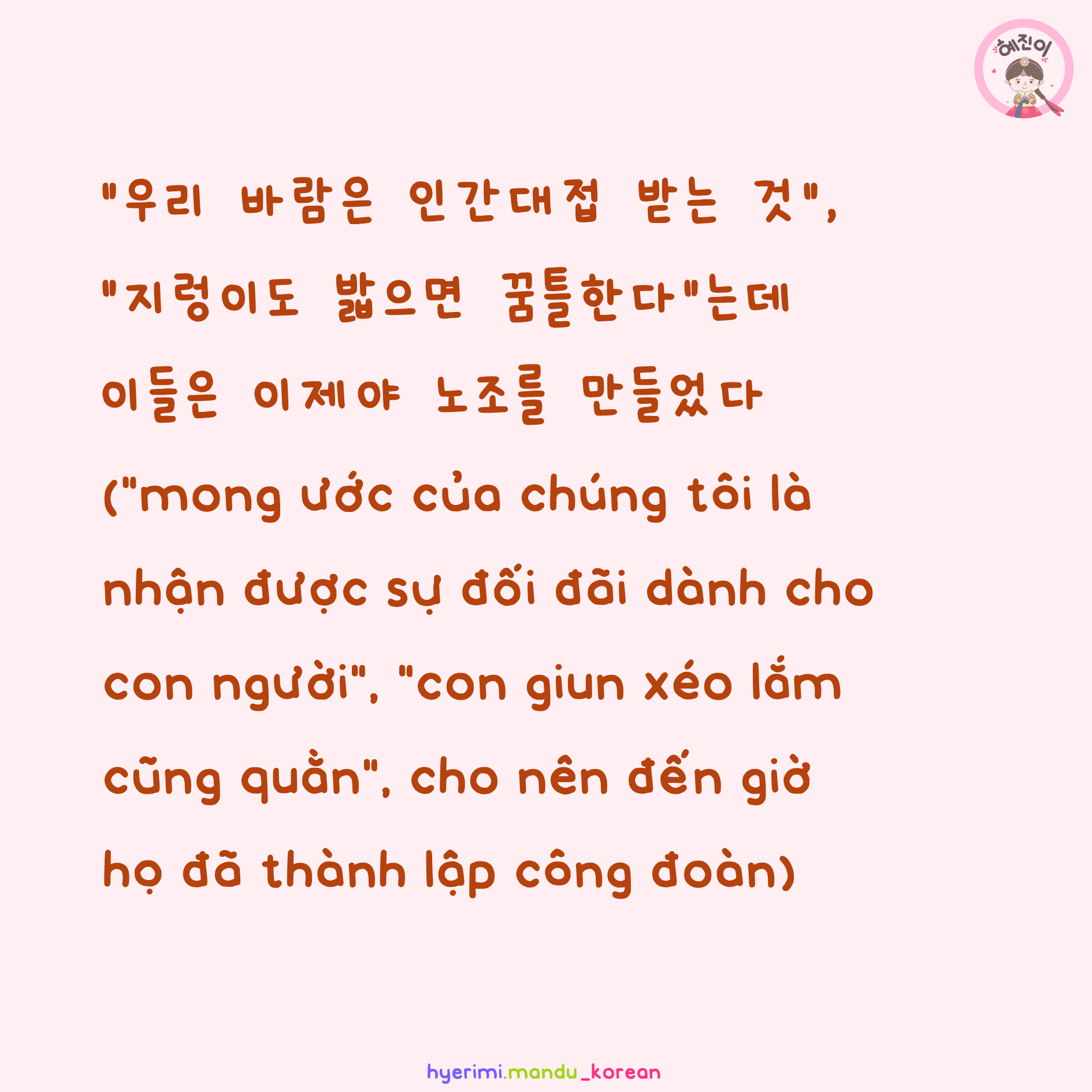 "우리 바람은 인간대접 받는 것" "지렁이도 밟으면 꿈틀한다"는데 이들은 이제야 노조를 만들었다 ("mong ước của chúng tôi là nhận được sự đối đãi dành cho con người" "con giun xéo lắm cũng quằn", cho nên đến giờ họ đã thành lập công đoàn)