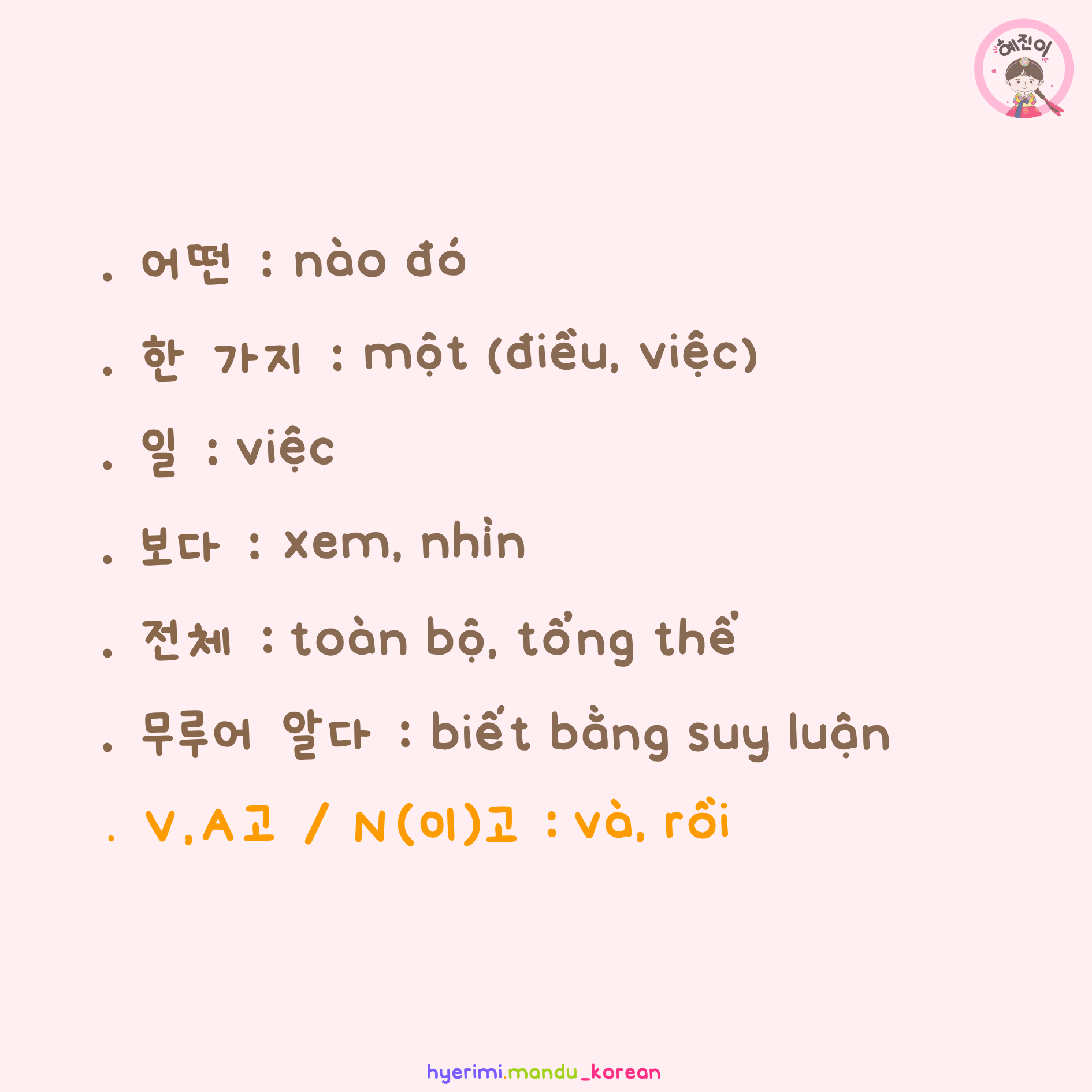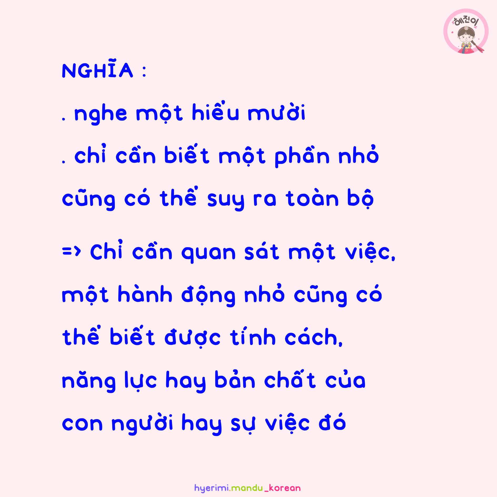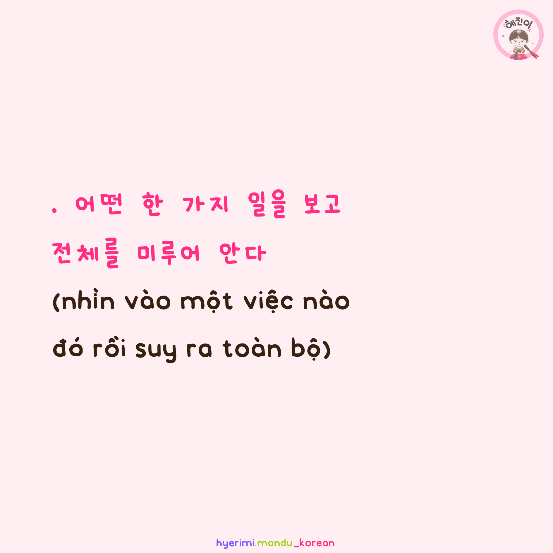 . 어떤 : nào đó . 한 가지 : một (điều, việc) . 일 : việc . 보다 : xem, nhìn . 전체 : toàn bộ, tổng thể . 무루어 알다 : biết bằng suy luận . V,A고 / N(이)고 : và, rồi