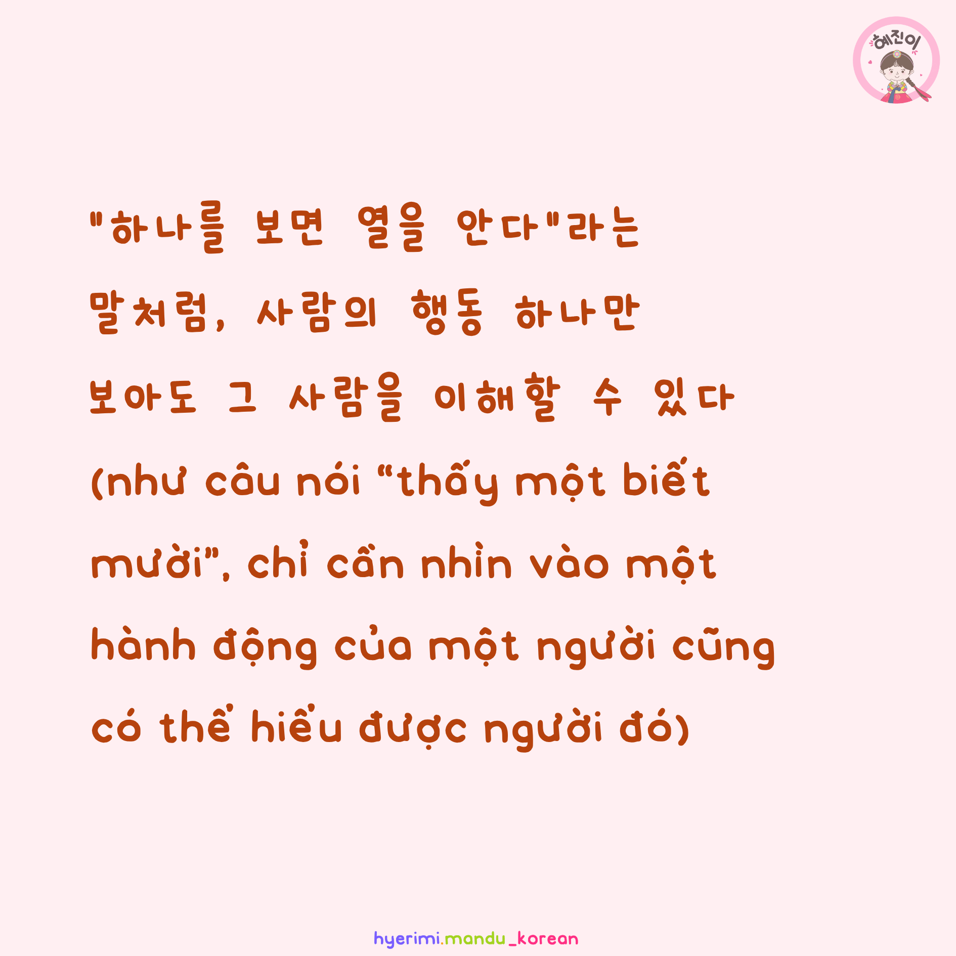 "하나를 보면 열을 안다"라는 말처럼, 사람의 행동 하나만 보아도 그 사람을 이해할 수 있다 (như câu nói “thấy một biết mười”, chỉ cần nhìn vào một hành động của một người cũng có thể hiểu được người đó)