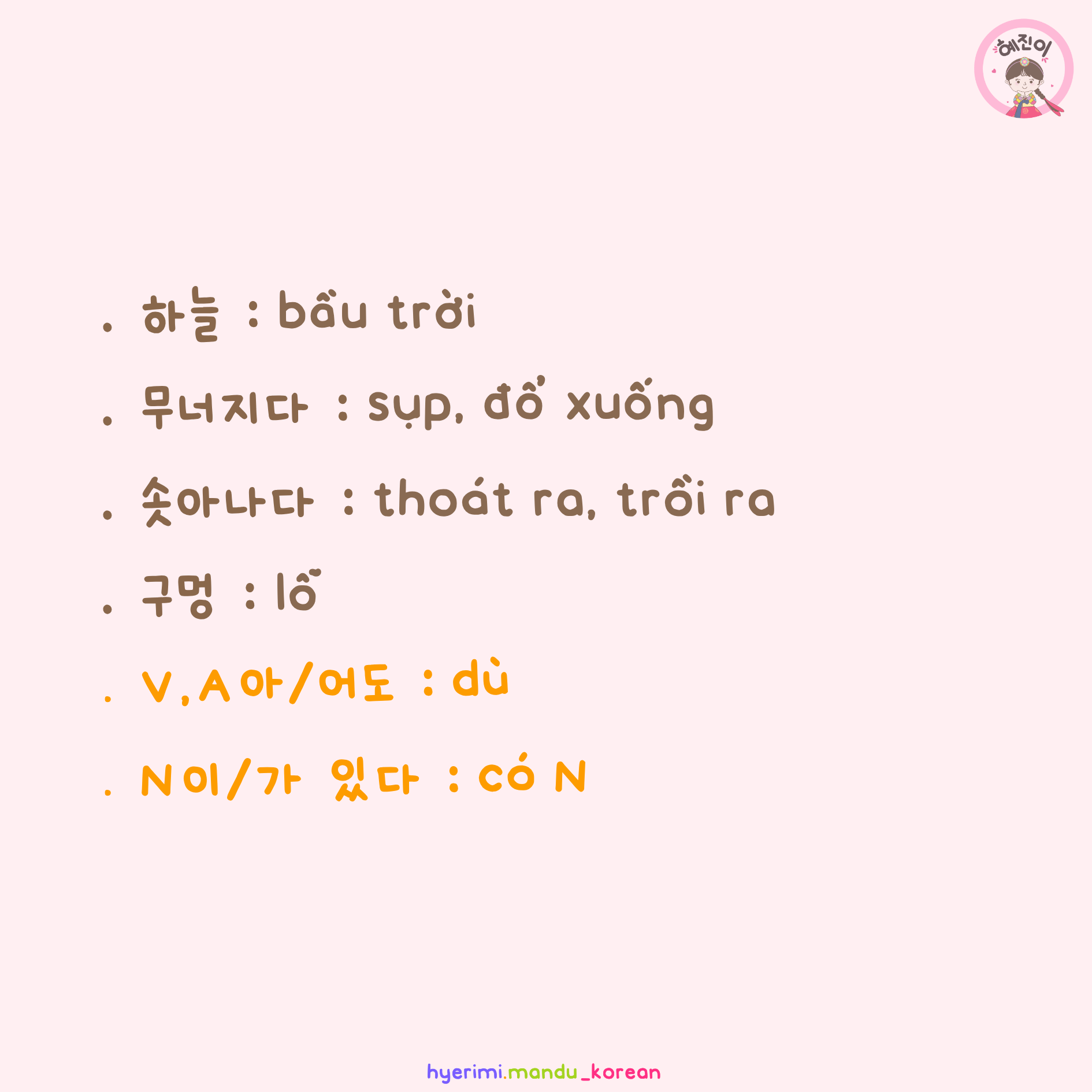 . 하늘 : bầu trời . 무너지다 : sụp, đổ xuống . 솟아나다 : thoát ra, trồi ra . 구멍 : lỗ . V,A아/어도 : dù . N이/가 있다 : có N
