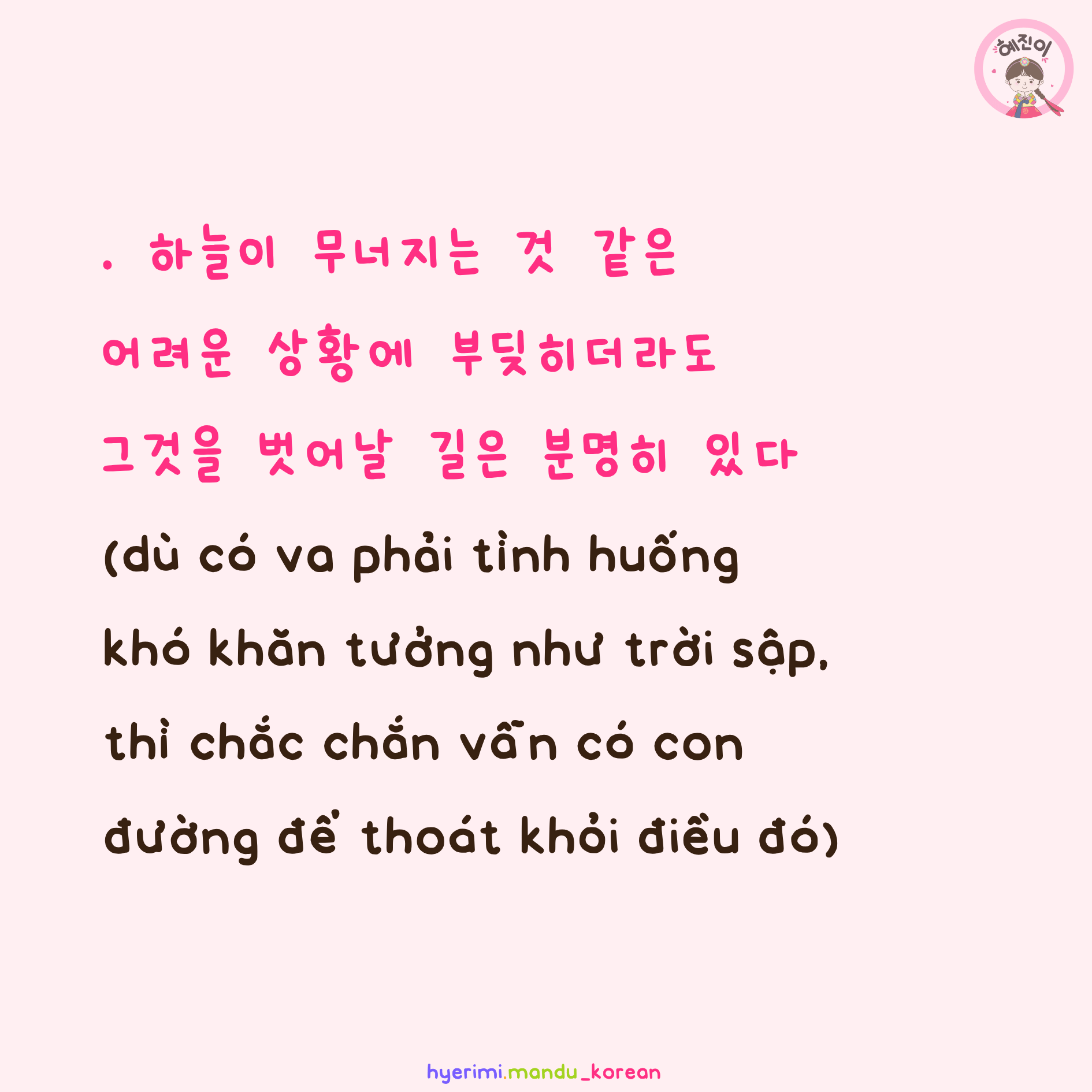 . 하늘이 무너지는 것 같은 어려운 상황에 부딪히더라도 그것을 벗어날 길은 분명히 있다 (dù có va phải tình huống khó khăn tưởng như trời sập, thì chắc chắn vẫn có con đường để thoát khỏi điều đó)