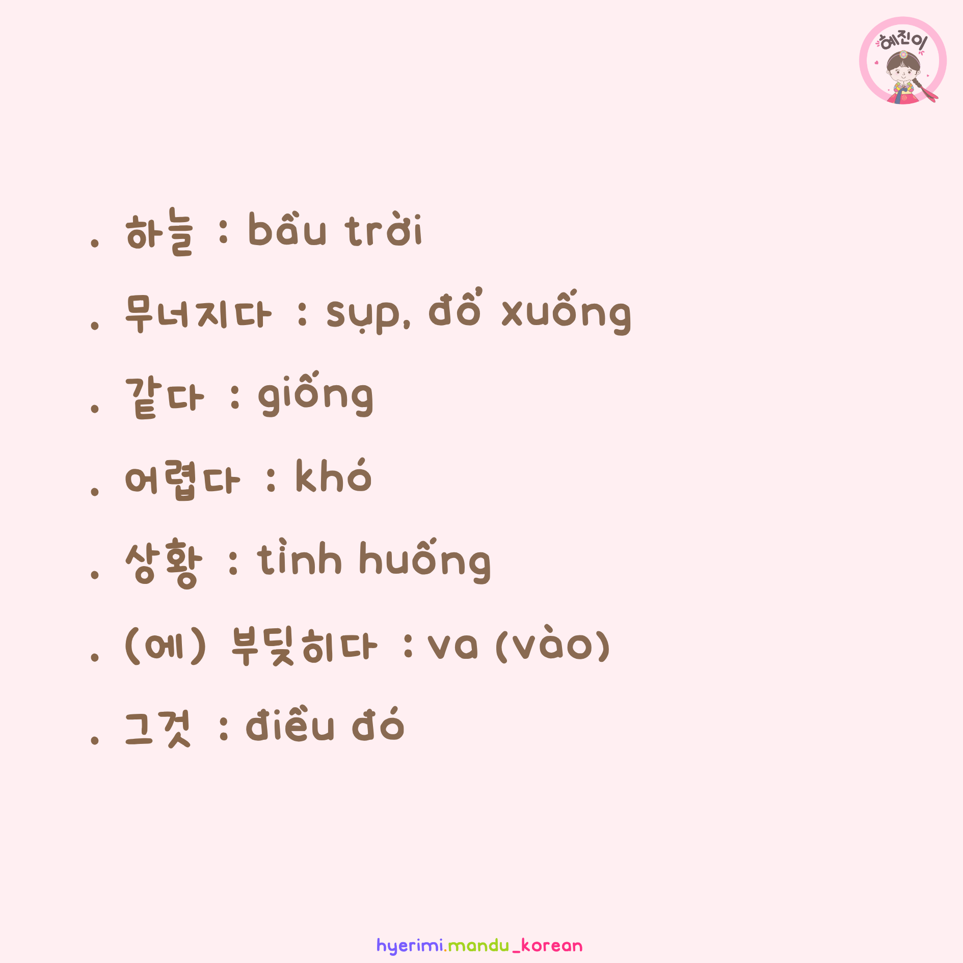 . 하늘 : bầu trời . 무너지다 : sụp, đổ xuống . 같다 : giống . 어렵다 : khó . 상황 : tình huống . (에) 부딪히다 : va (vào) 그것 : điều đó