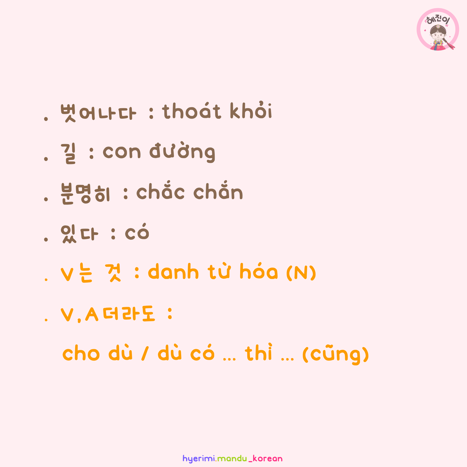 . 벗어나다 : thoát khỏi . 길: con đường . 분명히 : chắc chắn . 있다 : có 그것 : điều đó . V + 는 것 : danh từ hóa (N) . V,A더라도 : cho dù / dù có ... thì ... (cũng)