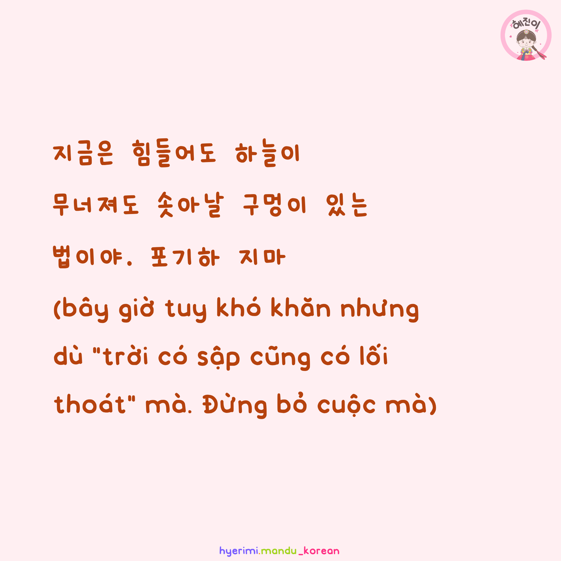지금은 힘들어도 하늘이 무너져도 솟아날 구멍이 있는 법이야. 포기하 지마 (bây giờ tuy khó khăn nhưng dù "trời có sập cũng có lối thoát" mà. Đừng bỏ cuộc mà)
