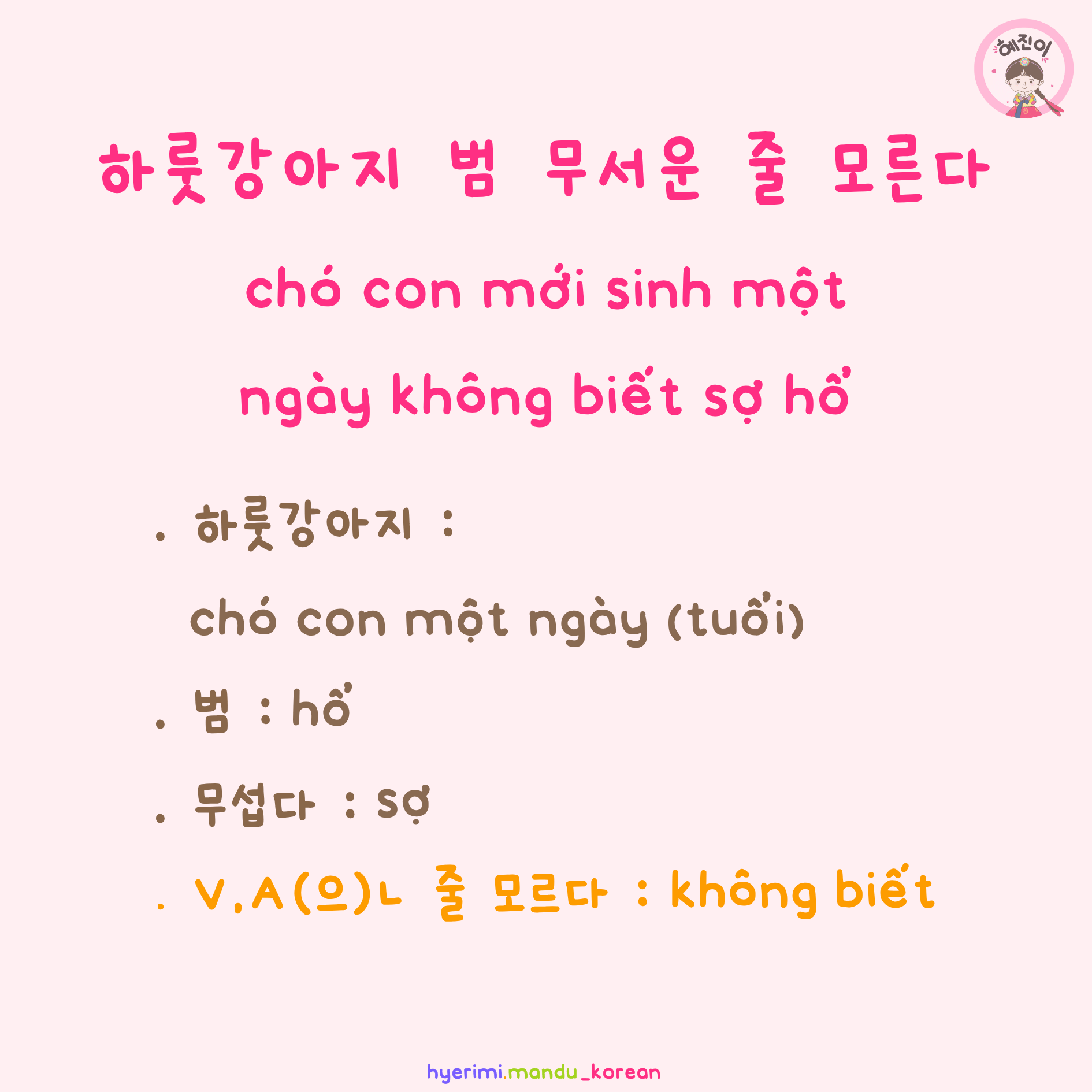 [TỤC NGỮ] 하룻강아지 범 무서운 줄 모른다 (Chó con mới sinh một ngày không biết sợ hổ)