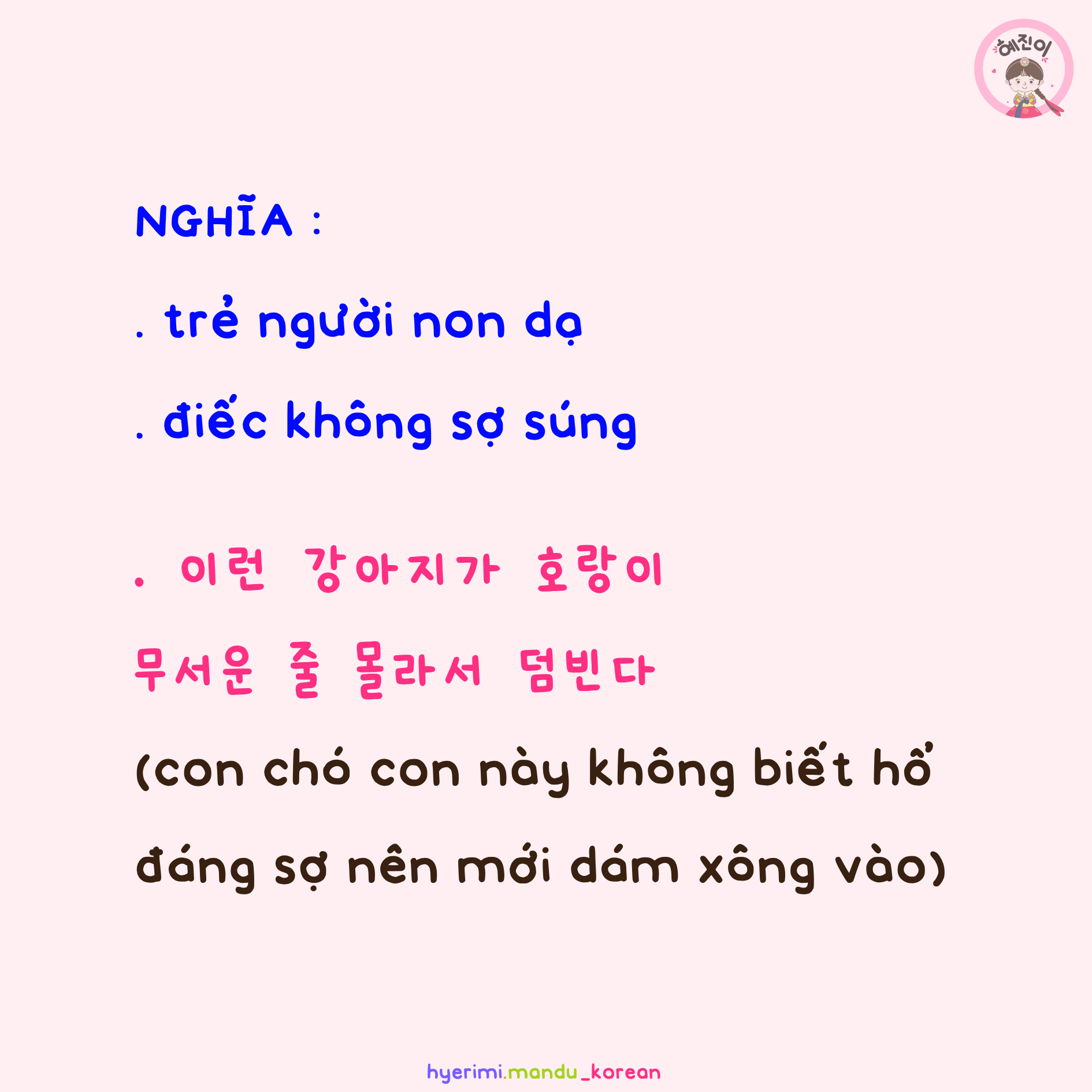 . 하룻강아지 : chó con một ngày (tuổi) . 범 : hổ . 무섭다 : sợ . V,A(으)ㄴ 줄 모르다 : không biết