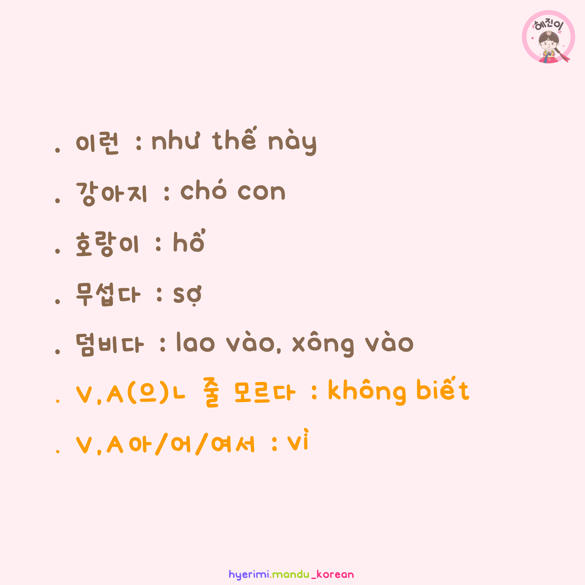 . 이런 : như thế này . 강아지 : chó con . 호랑이 : hổ . 무섭다 : sợ . 덤비다 : lao vào, xông vào . V,A(으)ㄴ 줄 모르다 : không biết . V,A아/어/여서 : vì