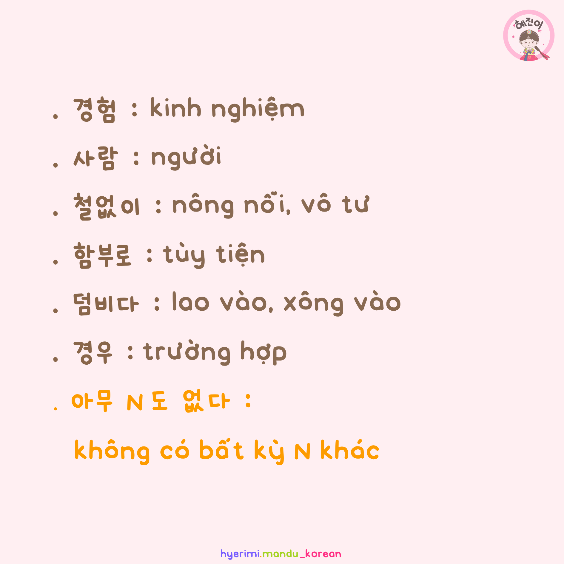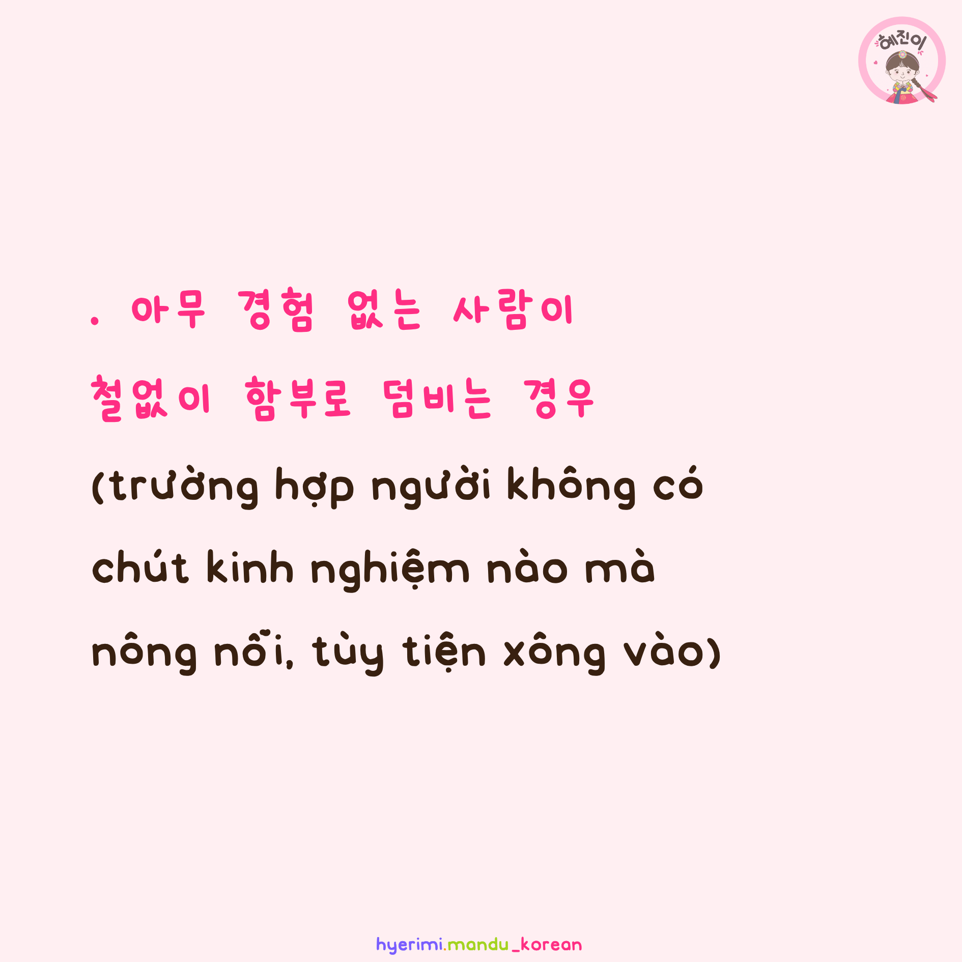 . 경험 : kinh nghiệm . 사람 : người . 철없이 : nông nỗi, vô tư . 함부로 : tùy tiện . 덤비다 : lao vào, xông vào . 경우 : trường hợp . 아무 N도 없다 : không có bất kỳ N khác