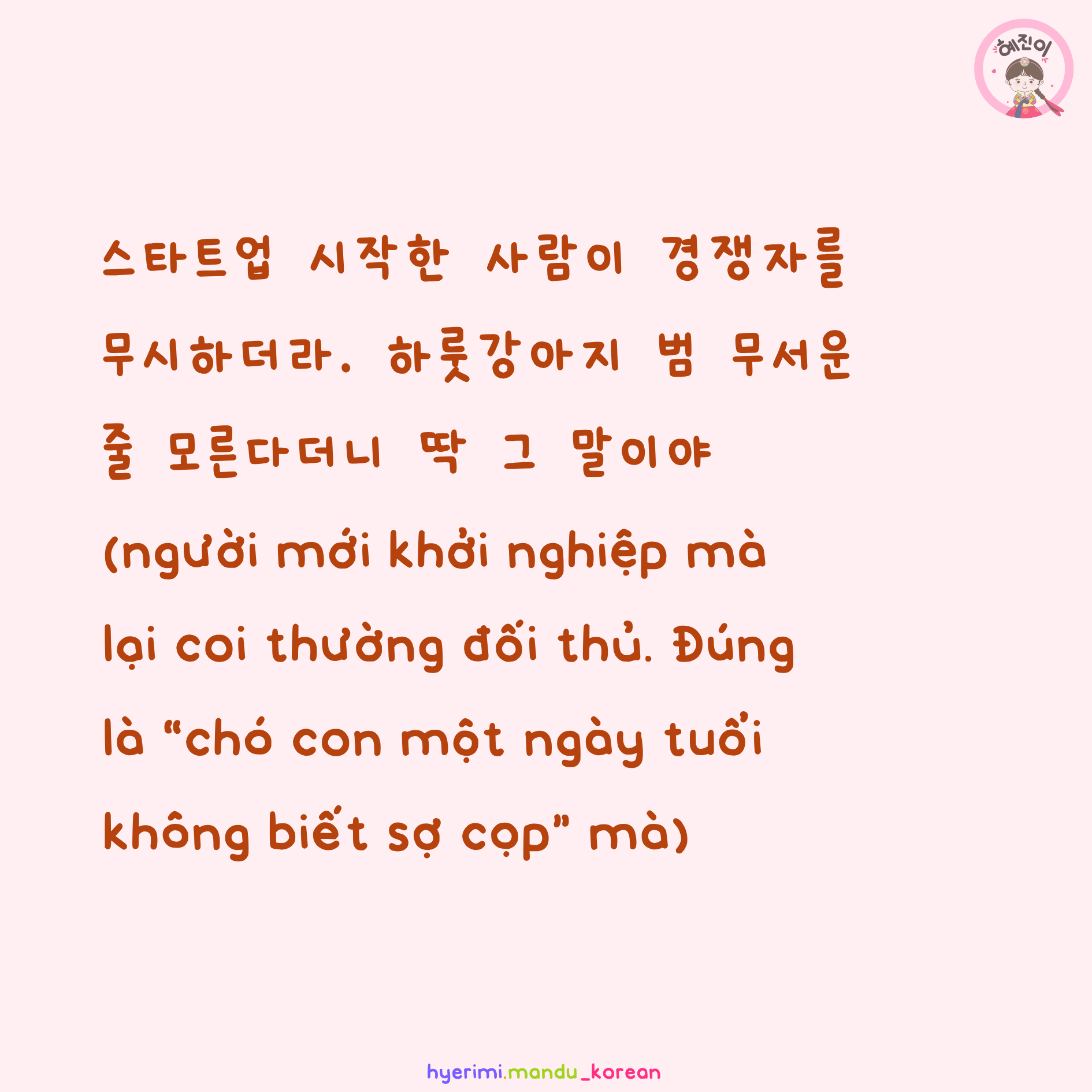 스타트업 시작한 사람이 경쟁자를 무시하더라. 하룻강아지 범 무서운 줄 모른다더니 딱 그 말이야 (người mới khởi nghiệp mà dám coi thường đối thủ. Đúng là “chó con một ngày tuổi không biết sợ cọp” mà)